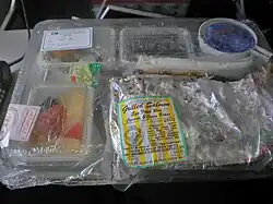 "Kosher" is one of several options for special meals offered to air travelers.[1] Similarly styled meals that are packaged in double wrapping with verifiable kashrut certification are offered in a variety of other settings, such as cruise ships, hospitals, or catered events.[2] The double wrapping allows for the meals to be heated in a non-kosher oven.[3]