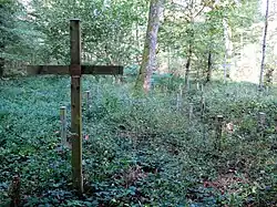 Kostanjevica na Krki is the location of one of two known mass graves associated with the Second World War in the Krakovo Forest. The sites consist of 10 large mounds and contain the remains of an undetermined number of Croatian prisoners of war, civilians, and possibly German soldiers as well. The Krakovo Forest 2 Mass Grave (Grobišče Krakovski gozd 2) lies about 800 meters (2,600 ft) northeast of the north bridge across the Krka River in Kostanjevica na Krki and about 200 meters (660 ft) from the bridge across Sajevec Creek. The site is marked by a large mound with a cross next to it.[7] The grave site was created simultaneously with the Krakovo Forest 1 Mass Grave (Slovene: Grobišče Krakovski gozd 1) in neighboring Sajevce.[8] The two sites were created around May 15, 1945, when Partisan forces captured about 4,000 Croatian soldiers and civilians at Dobruška Vas fleeing toward Austria. They were held on the left bank of the Krka River and killed in the forest over the course of a few days; eyewitnesses stated that the victims included children, women, and elderly persons.[9]