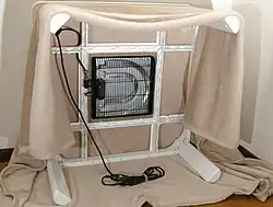 A kotatsu (Japanese: 炬燵 or こたつ) is a low, wooden table frame covered by a futon, or heavy blanket, upon which a table top sits. Underneath is a heat source, formerly a charcoal brazier but now electric, often built into the table itself.[1] Kotatsu are used almost exclusively in Japan, although similar devices for the same purpose of heating are used elsewhere, e.g. the Spanish brasero or Iranian korsi.