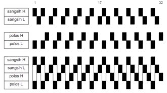 Polos 1 2 . 1 2 . 1 2 . 1 2 . 1 2 . 1 etc... Sangsih . 2 3 . 2 3 . 2 3 . 2 3 . 2 3 . etc... Pokok 1 . . . 2 . . . 3 . . . 1 . . . etc...
