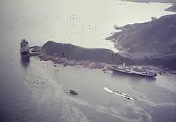 On 9 August 1944, Koto Maru was spotted and reported on by agents of the British Army Aid Group as part of their Naval Section's Kweilin Intelligence Summary No. 70. The ship was recorded as having arrived at Hong Kong around 18 July from Canton and had been laid up for repairs at the Taikoo Dockyard for repairs to its stern, hull, propeller, and rudder for discharge on around 1 September. The vessel was recorded as having a light grey colour scheme with armament modifications including an anti-aircraft machine gun on the bridge and was crewed by 4 Japanese, 30 Chinese and 6 Indian sailors.[12][13]