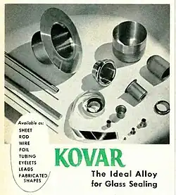 Kovar (trademark of CRS Holdings, inc., Delaware[1]) is a nickel–cobalt ferrous alloy compositionally identical to Fernico 1, designed to have substantially the same thermal expansion characteristics as borosilicate glass (≈5 ppm/K between 30 and 200 °C, to ≈10 ppm/K at 800 °C) to allow a tight mechanical joint between the two materials over a range of temperatures. It finds application in glass-to-metal seals in scientific apparatus, and conductors entering glass envelopes of electronic parts such as vacuum tubes (valves), X-ray and microwave tubes and some lightbulbs.