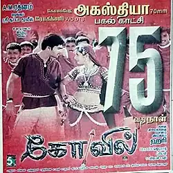 Kovil (transl. Temple) is a 2004 Indian Tamil-language romantic drama film written and directed by Hari and produced by A. M. Rathnam. It stars Silambarasan and Sonia Agarwal while Vadivelu, Rajkiran, Charle and Nassar play supporting roles. The music was composed by Harris Jayaraj, with editing done by V. T. Vijayan and cinematography by Priyan. The film was released on 10 January 2004 and became a box office hit.[1]