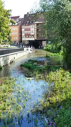 The Krämerbrücke (pronounced [ˈkʁɛːmɐˌbʁʏkə]; Merchants' bridge) is a medieval arch bridge in the city of Erfurt, in Thuringia, central Germany, which is lined with half-timbered shops and houses on both sides of a cobblestone street. It is one of the few remaining bridges in the world that have inhabited buildings. It has been continuously inhabited for over 500 years, longer than any other bridge in Europe.[1][2] The stone, pedestrian bridge, which dates from 1325, is one of the oldest secular structures in Erfurt.[3] It spans the Breitstrom, a branch of Gera River, and connects two town squares – Benediktsplatz and Wenigemarkt.