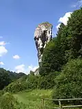 The Polish Jura consists of a hilly landscape with Jurassic limestone rocks, cliffs, valleys and vast limestone formations, featuring some 220 caves. The relief of the upland developed since the Paleogene, under climatic conditions changing considerably. Its main component is a peneplain, crowned by monadnocks, rocky masses that resisted erosion, generated as hard rock on Late Jurassic buildup surrounded by less resistant bedded limestone of the same age.[1] The Polish Jura is visited by roughly 400,000 visitors a year. Part of it belongs to the Ojców National Park, the smallest of Poland's twenty national parks, ranking among the most attractive recreational areas of the country.[2]