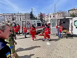 A World Central Kitchen aid worker who witnessed the attack in Kramatorsk said that he had heard "between five and ten explosions".[15] Reports described the scene as extremely bloody, with several people losing limbs from the explosions. Victims' bodies were strewn around amid abandoned luggage.[9][19]