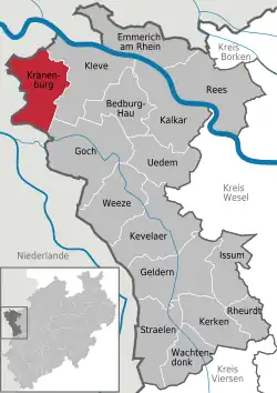 Kranenburg is a municipality in the district of Cleves in the state of North Rhine-Westphalia, Germany. It is located near the border with the Netherlands, 12 kilometres (7 mi) south-east of Nijmegen and 11 kilometres (7 mi) west of Cleves.