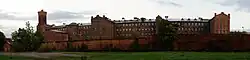 The factories were built with limestone from a local quarry; all the structures for workers were built with logs.[7] As the Baltic Sea is only about 16 km away, large cotton warehouses were erected in the harbour at the mouth of the river where cotton, imported directly from the United States or Liverpool, was stored and brought up the river to the mill as needed.[8] A new spinnery was built on the island in 1870, and the company bought the adjacent Georgiyevsky Island in 1872 and built another mill there in 1899.[9] The company also purchased Joala Manor and converted it into a mill in 1884, expanding it in 1890.[9] The complex initially manufactured calico and received its raw materials from the Americas, Egypt, and India. The introduction of the St. Petersburg–Tallinn (Reval) railroad opened up Central Asian markets.[9] In 1893 it contained 340,000 spindles, 22,000 looms, and employed 7,000 people.[10] Professor Gerhart von Schulze-Gävernitz visited the mills in the 1890s stating that "the whole place is a bit of England on Russian ground."[2]