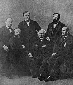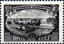 In 1856, a pioneer of the cotton industry,[4] Ludwig Knoop, purchased the island of Kreenholm for 50,000 roubles from the heirs of a local merchant Sutthoff.[5] The manufacturing company was founded a year later in 1857 by Knoop, along with initial investors Kuzma Soldatyonkov, Aleksey Khludov, Gerasim Khludov, Richard Barlow, and Ernst Kolbe.[6] It was listed as a joint stock operation initially made up of 400 shares at 5,000 roubles each, valuing the company at 2 million roubles. The charter was approved by Tsar Alexander II on July 23, 1857.[5] Knoop was the director general of the company until his death in 1894, Johann Prowe succeeded him in this position.[5]