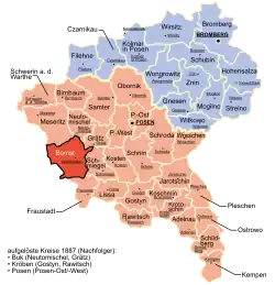 The district of Bomst was a Prussian district which existed from 1793 to 1807 in the province of South Prussia and from 1815 to 1938 successively in the Grand Duchy of Posen, the Province of Posen and the Frontier March of Posen-West Prussia. The district capital was Wollstein.