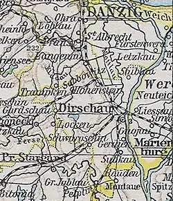 The continuous growth of the population prompted a district reform in West Prussia. In October 1887, the new Dirschau district was created, consisting of parts of the Danzig district and the Preußisch Stargard district. The seat of the district office and the only town in the district was Dirschau (today Tczew). The district had a German majority and a significant Polish minority.[3]