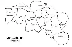 Standesamt is the German name of the local civil registration offices which were established in October 1874 soon after the German Empire was formed. Births, marriages and deaths were recorded. Previously, only duplicate copies of church records were used. By 1905, Kreis Schubin had the following 14 offices for rural residents:[1]