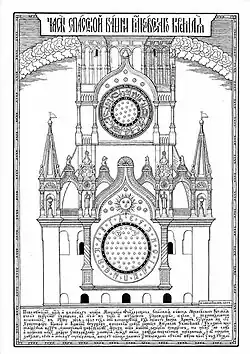 The clock face of the Spasskaya Tower clock, was formerly divided into 17 equal parts, each corresponding to one hour of daylight on the longest day of the year, the summer solstice. The clock featured an image of the sun suspended on the centered upper portion of the clock face above the dial, with its "static" hour-hand in the form of an elongated beam of sunlight, indicating the hours. The clock face was labeled with the Cyrillic numerals and rotated in counter-clockwise sens. The characters were about 71 centimetres (28 in) tall (one arshin), cast in brass and covered with gold leaf. The Clock face of the drawing of the Spasskaya Tower on the right, is marking half past four.[2]