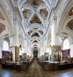 The main church is dedicated to "Christ the Saviour and St. Agapitus" (Zum Heiligen Erlöser und zum Heiligen Agapitos). Construction was completed in 1277, in the late Romanesque and early Gothic styles. After 1613 the church was remodelled in the Baroque style. Between 1680 and 1720, the interior of the church was redecorated with splendid Baroque ornamentation to designs by Carlo Antonio Carlone, Giovanni Battista Colomba and Giovanni Battista Barberini.