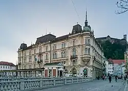 The building has an irregular square plan and an inner court.[9] It is noted for its Neo-Renaissance façades and interior.[9] The decoration reminds of the Baroque.[1] It was designed by the Graz architect Leopold Theyer and erected in 1897 and 1898, after the earthquake in 1895.[9] The entrance portal of the building faces the Adamič and Lunder Embankment. There is a balcony with a wrought iron fence above it, and above the balcony, there is a coat of arms of the town of Ljubljana in a cartouche, encased with a sculpture of a genius on each side. The genii are work of the sculptor Alojzij Repič (1866–1941).[10]