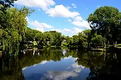 After the outbreak of the World War II, Kretinga's city centre was bombarded and burned down.[1] During World War II, the Nazi occupation saw the elimination of Kretinga's Jewish population. In June 1941, German forces and Lithuanian collaborators took about 200 Jewish men and some Lithuanian communist activists to a forest outside the town and shot them in pits that some of the Jewish men had been forced to dig. Several more mass shootings including women and children took place in July at the Kretinga Jewish cemetery.[5] As in neighbouring Palanga, local Lithuanian nationalists volunteered to assist in the killing of Jewish citizens as soon as the German army and police units had arrived.[6][7]