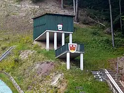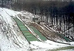 The Kreuzberg ski jumping hills (German: Kreuzbergschanzen) are located near Haselbach, a district of Bischofsheim in der Rhön, on the northern slope of the 928 meter[1] high Kreuzberg in the Bavarian Rhön. The ski jumping facility, which is 600 meters[1] above sea level, consists of three plastic-covered ski jumping hills (K-points: 16, 30 and 50 meters), which meet the latest FIS standards and are mainly used by junior ski jumpers. Today, the Kreuzberg ski jump is the only ski jump in the Rhön and Lower Franconia, making it the ski jump center of the Lower Franconia ski region. The ski jumps are operated jointly by the Haselbach Cycling and Winter Sports Club (RWV) and the Oberweißenbrunn Winter Sports Club (WSV).