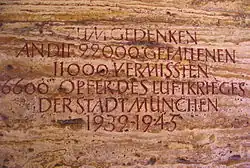 Originally, the names of the KIA from Munich were engraved into the walls. Due to the damage from World War II, the memorial was rebuilt without the names, as the old inscription was destroyed and the list of names that was originally used became lost. But instead the sentence "Zum Gedenken / an die 22.000 Gefallenen / 11.000 Vermissten / 6.600 Opfer des Luftkrieges / der Stadt München / 1939-1945" ("For the commemoration / of the 22,000 killed in action / 11,000 missing in action / 6,600 casualties of the aerial warfare / in the city of Munich / 1939-1945") was added on the inside.