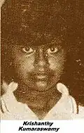 Krishanti Kumaraswamy (Tamil: கிருஷாந்தி குமாரசுவாமி), also spelled Krishanthi Kumaraswamy, was a Tamil schoolgirl in Jaffna, Sri Lanka who was raped and murdered on 7 September 1996 by six Sri Lankan Army soldiers. The effort to bring her assailants to justice became a cause célèbre as a part of the protest against atrocities committed by the Sri Lankan Army during the Sri Lankan civil war.