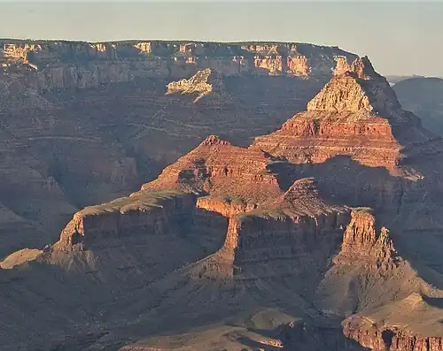 Like Rama Shrine (at east), Krishna Shrine is composed of the same geology units: a massif of 4-unit Supai Group, upon the platform of the cliff-former (and platform-former) Redwall Limestone. The upper surface of the landform is triangle-shaped-(northwest), and a small eroded peak-(southeast); the high-point prominence is at the northwest and is a remainder, fractured cliff-peak of the Supai, unit 4, the cliff-forming Esplanade Sandstone famous in the Grand Canyon for forming platforms. (The prominence-platform of Rama Shrine is an extensive Esplanade layer (with slope-former debris of soft Hermit Shale).)