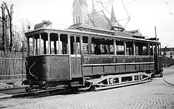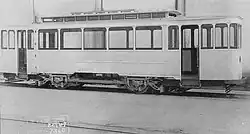 The second class consisted of fourteen units delivered by Skabo between 1887 and 1892. These were delivered in various configurations of open and closed seating and were normally only operated during winter. They had the same dimensions as the Stephenson cars.[1] The final class, built by Falkenried, consisted of fifteen units delivered in 1897. Measuring 6.6 meters (22 ft) in length, they were sufficiently heavy they needed to be hauled by two horses. This was a calculated choice, as they were primarily intended to be used as trailers for the electric trams.[6]