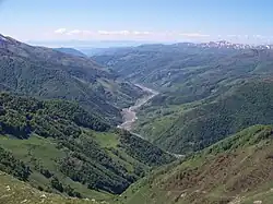 The Ksani (Georgian: ქსანი, Ossetian: Чысандон, Ĉysandon) is a river in central Georgia, which rises on the southern slopes of the Greater Caucasus Mountain Range in South Ossetia and flows into the Kura (Mtkvari). It is a left tributary of the Kura. The Ksani is 84 km (52 mi) long, and has a drainage basin of 885 km2 (342 sq mi).[2] Ksani (both the river and the name) is often associated with the Medieval Georgian Ksani fortress which lies near the confluence of the Ksani and the Mtkvari.
