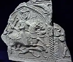 Excavations at Kubadabad Palace uncovered a magnificent series of polychrome ceramic tiles now held in Konya's Karatay Museum. Painted with an underglaze of blue, purple, turquoise and green, the series consists of white, star-shaped figural panels alternating with turquoise crosses. Similar tiling has also been found on the Roman theater at Aspendos, which Kayqubad had converted into a palace. The subjects of the tiles include humans, and animals both real and fantastic. Of particular interest are two tiles thought to show a portrait of the sultan[7] and another showing a double-headed eagle inscribed "al-sultān." The same symbols appear on other works sponsored by Kayqubad, such as the city walls of Konya.[3]