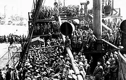 On the night of March 26, in Novorossiysk warehouses were burning, and tanks with oil and shells were exploding. The evacuation was conducted under the cover of the second battalion of the Royal Scots Fusiliers under command of Lieutenant-Colonel Edmund Hakewill-Smith and the Allied squadron commanded by Admiral Seymour, which fired towards the mountains, preventing the Reds from approaching the city. At dawn on March 26, the last ship, the Italian transport Baron Beck entered the Tsemessky Bay, causing great turmoil as the people didn't know where it would land. The panic reached its apogee when the crowd rushed to the gangway of this last ship. The military and civilian refugees on the transport ships were taken to the Crimea, Constantinople, Lemnos, the Prince Islands, Serbia, Cairo, and Malta.