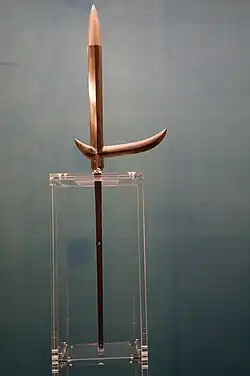 - Hoko yari, an old form of yari possibly from the Nara period (710–794),[14] a guard's spear with 6 ft (1.8 m) pole and 8 in (200 mm) blade either leaf-shaped or waved (like keris); a sickle-shaped horn projected on one or both sides at the joint of blade.[15] The hoko yari had a hollow socket like the later period fukuro yari for the pole to fit into rather than a long tang.[16]
