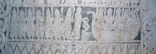 The core of this tradition is the story of Hilde's abduction and a battle on an island between her father Hagen and her abductor Hetel. This tradition is attested in Germany as early as the middle of the twelfth century, when a fierce battle on the island Wolfenwerde (in Kudrun, Wülpensand) is mentioned in Priest Lambrecht's Alexanderroman: "Hilde's father" is said to perish in the battle, and the names Hagen and Wate are given.[8] The version of events reported by Priest Lambrecht accords generally with other attestations, namely from Scandinavia, where it is known as Hjaðningavíg. Snorri Sturluson reports two versions of the tale in the Prose Edda: in one, Hildr (Hilde) attempts to mediate between her father Högni (Hagen) and Heðin (Hetel) during the battle and awakens the dead to life every night. In another, quoted from the poem Ragnarsdrápa, Hildr encourages the fight and prevents its end.[9] Another version is reported by Saxo Grammaticus. The earliest attestation of the saga appears to be a picture stone (Smiss I) from Gotland, Sweden, which shows a woman attempting to mediate between warriors on land and on a ship.[10] The saga is also attested in Anglo-Saxon England of the ninth and tenth centuries, where the poems Deor and Widsith mention the names Hagena (Hagen), Heoden (Hetel), Wada (Wate), and Heorrenda (Horant) without, however, giving any indication of their story.[8][11]