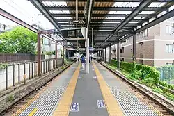 The station consists of a ground-level island platform serving two tracks. The station has an above-track station building, completed in 2005.[2] The station previously had a ground-level station building at the north exit, connected by an underground passageway.