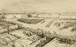 The town was founded as Kuka in 1814 by Shehu Muhammad al-Amin al-Kanemi of the Bornu Empire. He intended for it to serve as his capital after the fall of the previous capital, Ngazargamu.[1] The town was the end of one of the main trans-Saharan trade routes to Tripoli on the Mediterranean coast.[2] It was visited by German explorer Heinrich Barth in 1851 who travelled from Tripoli seeking to open trade with Europe and explore Africa,[1] and again in 1892 by the French explorer Parfait-Louis Monteil, who was checking the borders between areas of West Africa assigned to the French and the British by the Treaty of Berlin.[3]
