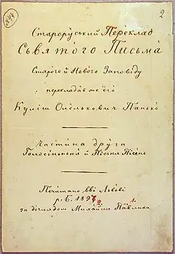 During 1868–1869, Panteleimon Kulish published in the Lviv magazine Pravda translations of several Psalms of David under the pseudonym Pavlo Ratai, as well as two songs of Moses ("Songs over the Red Sea" and "Songs of the Dying") and, finally, the entire Torah. In an explanatory note, Kulish declared his translation "just a proofreading", urging readers to make changes and clarifications.[4] In 1871, in cooperation with Pulij, Kulish translated the New Testament from Greek, first publishing separate Gospels: the Gospel according to Matthew (also: according to Mark, according to Luke, according to John) in Vienna in 1871 and in Lviv in 1880. In 1887, the Gospel was published in a separate edition in Vienna by the Bible Society.[5]
