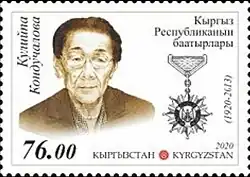 After her retirement from the Ministry, in 1980,[5][9] Konduchalova continued her work with the Society for the Protection of Historical and Cultural Monuments.[6] Among the many awards bestowed upon Kondychalova, she was honored with the Order of Lenin, twice received the Order of the Red Banner of Labour, and the Order of the Badge of Honour from the USSR. In her own country, she was knighted twice receiving the Order of Manas in both the 1st and 3rd degree.[11] In 2010,[12] she received the highest national honor,[11] Hero of the Kyrgyz Republic with the special distinction "Ak-Shumkar", from President Roza Otunbayeva[12] In 2011, Munduzbek Tentimishev published the biography Легендарлуу өмүр: Күлүйпа Кондучалова (Legendary Life: Kuluypa Konduchalova), dedicated to one of the few women who rose in political rank in her era.[9][11]