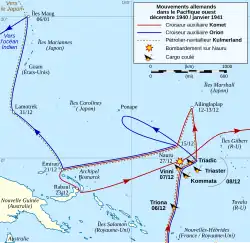 On 12–13 December Kulmerland refuelled Komet at Ailinglaplap Atoll. The Fernost-Verband then went west to Emirau in the Bismarck Archipelago, where on 21 December Kulmerland refuelled Orion and the Germans disembarked 514 captives.[16] Komet then headed south to Rabaul, while Kulmerland and Orion headed north to the Maug Islands, where they parted company. Orion headed for the Indian Ocean, while Kulmerland returned to Japan, where she arrived on 31 December.[17][18]