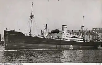On 3 September 1941 Kulmerland left Kobe carrying fuel oil, supplies, and white metal engine parts for the German auxiliary cruiser Kormoran. The two ships met at sea on the Indian Ocean west of Australia on 16 October. The two ships sailed together until 24 October. Kormoran transferred to Kulmerland 86 PoWs and internees, plus five German sailors to guard them.[19][20]