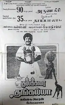 Kumbakarai Thangaiah is a 1991 Indian Tamil-language film, directed by Gangai Amaran and produced by Ramumachan. The film stars Prabhu, Kanaka, Pandiyan and M. N. Nambiar. It was released on 14 January 1991.[1] Music was applauded but movie received negative reviews and was a box office failure.
