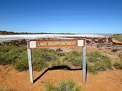 - ^ "It was left to Frank Hann in the course of an exploring/prospecting expedition travelling east from Nullagine to sight and name the lake on 20 April 1897. Hann had travelled from Nullagine across the Davis River to the Coolbro Creek, then to the southeast following and naming the Broadhurst Range, crossing the upper Rudall River and the Cotton Creek as far as the Harbutt Range where he turned south to the Mckay Range. Here to the southward he sighted a large lake ten miles distant, and they made their way to it next day, but 'found it was all white salt ... it is the largest thing in lakes I ever saw ... I shall call the lake Lake Disappointment as I was disappointed in not finding water in it."[9]