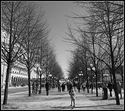 However, the demolition of the walls began in the early 19th century, and for the inauguration of the statue of Charles XIII in 1821, his successor Charles XIV John had most of the garden replaced by a gravelled open space ordered to be named "Square of Charles XIII". When Makalös was destroyed by fire in 1825 the park was extended south down to the waterfront. Notwithstanding the area became a popular spot for bourgeois social life and military drilling, Charles XIV's initiative never was appreciated, and in the 1860s the space was subsequently furnished with the tree-lined avenues still giving the park its character and through which the old name prevailed. In addition, the park's showpiece, the tall and elaborate Molin's Fountain, was cast in bronze and given a space in the park.[8][9]