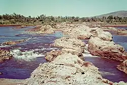 The history of the idea of agriculture on the Ord River dates from the 19th century. On the first pastoral lease map (held by WA State Records Office) for the area dated 1887, it shows the northern bank between Wyndham and Kununurra, near House Roof Hill was held as a "Concession for Sugar Cane Planting," although it was never taken up. The idea of tropical agriculture on the Ord was discussed much from the earliest dates, but the land remained under pastoral lease until 1960. Kununurra was built on land resumed from Ivanhoe Station pastoral lease before 1961,[2] as the town for the Ord River Irrigation Area which started as the Ord River Project or Ord Scheme, with survey work starting in 1959. Lake Kununurra is the flooded section of the Ord River valley that was formerly known as Carlton Reach, which was at times a 10-kilometre-long (6.2 mi) waterhole held back by the natural rock barrier known as Bandicoot Bar. At this site in 1959 drilling and blasting marked the start of construction of the Ord River Diversion Dam, which is anchored down onto the Bandicoot Bar. This dam with twenty radial flood gates was almost completed when visited by Queen Elizabeth II and Prince Philip in March 1963, then later completed and officially opened by then Prime Minister, Robert Menzies on 20 July 1963 when he said that Kununurra and the Ord River Irrigation Area (ORIA) is "... the most exciting place in Australia".