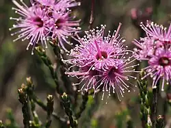 Kunzea opposita is a spindly shrub which grows to a height of 0.5–3 m (2–10 ft) with its young stems covered with fine hairs. The leaves are mostly arranged in opposite pairs along the branches and are narrow egg-shaped, 1–3 mm (0.04–0.1 in) long and less than 1 mm (0.04 in) wide on a very short petiole. The leaves are glabrous. The flowers are arranged in rounded groups of five to nine on the ends of the branches. There are lance-shaped to egg-shaped bracts which are 2–3 mm (0.08–0.1 in) long and 1–2 mm (0.04–0.08 in) wide, and smaller paired bracteoles at the base the flowers. The floral cup is 3–4 mm (0.1–0.2 in) long and hairy. The sepals are triangular to egg-shaped, 1–1.5 mm (0.04–0.06 in) long and sometimes hairy. The petals are pink, oblong to broadly egg-shaped, about 1.5 mm (0.06 in) long and there are 40 to 50 stamens in several rows. The stamens are 3–5 mm (0.1–0.2 in) long. Flowering occurs in August to November and is followed by fruit which an urn-shaped capsule about 3 mm (0.1 in) long and wide with the sepal lobes attached.[2][3]