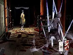 Kuon is a survival horror video game in which the player takes on the role of three characters—Utsuki, Sakuya, and Abe no Seimei—exploring the buildings and grounds of Fujiwara Manor.[2] The characters are seen from an overhead third-person fixed perspective.[3] The characters navigate the mansion during gameplay; the standard pace is a slow walk, with an option to run, but comes with a greater risk of attracting enemies.[3][4] To progress the game, the characters explore the mansion to solve puzzles and find key items.[5][6] Items are displayed in environments using flashing points of light.[3] From the beginning of the game, certain doors within the mansion grounds are sealed, and require a particular item to open. These items can be restricted to particular characters.[4][6]