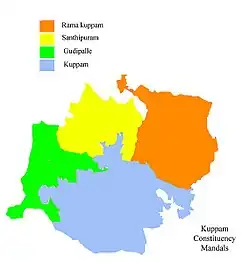 Kuppam is an assembly constituency (comprising Kuppam, Gudipalle, Shanthipuram, Ramakuppam mandals) in the Indian state of Andhra Pradesh. There are 1,61,872 registered voters in Kuppam constituency as of 1999. N. Chandrababu Naidu (current Chief Minister of Andhra Pradesh) is the current Member of Legislative Assembly (MLA) of Kuppam.