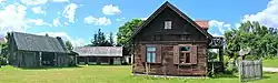 By the first quarter of the 20th century, all buildings were constructed only of wood using timber-frame construction, mainly used for residential buildings, or with a post-and-plank method. Houses were built according to one of three types characteristic of Puszcza Biała.[32] The first type was an asymmetrical wide-front building with an entrance on the side of the longer wall, built in a rectangular shape. Originally, these houses were single-room with a hall. Later, an additional room was added, which over time became a small chamber. Such houses were typical for small-scale farmers. The second type of house was a wide-front building with four rooms (a main room, a small chamber, a pantry, and a hall). This type developed from the first form under the influence of Kurpie settlement from Puszcza Zielona. In the interwar period, a third type of wide-front cottage appeared, which was constructed in the style of old serf houses. In this two-tract house, divided lengthwise by a hall into two parts on either side of the symmetry axis, two rooms were built. The entrance was from the road through an ornate porch to the hall and into the subsequent rooms, while the yard was accessed through the hall from the other side. After World War I, houses began to be built with cement blocks, which differed from traditional Kurpie construction. Life was centered in the most important room, the main room, which served residential, economic, social, and cultural functions, supported by its division into areas corresponding to these functions.[32][33]