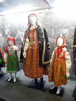 Family and social life were regulated by norms and behavioral patterns passed down from generation to generation, influencing the fulfillment of assigned roles based on age, gender, and social position. Men performed tasks that required more physical strength, such as farming, crafting tools and wooden items, building farmsteads, and doing repairs.[51] Women also worked in the fields and tended to potato cultivation, hay collection, and processing flax and hemp. They managed the household, cared for the children, worked with livestock, and maintained gardens and orchards. Additionally, they engaged in home-based crafts like weaving, sewing, and creating decorations and ritual art. Women played a central role in raising children, with support from husbands and grandparents. In the early years of life, children stayed under the mother's care, gradually helping with household and farming tasks.[51] Traditionally, children were responsible for herding cattle and poultry. Teenage girls learned all the domestic skills, while boys were prepared to run their farms by learning agricultural, animal husbandry, woodworking, hunting, fishing, and beekeeping skills. Grandparents contributed to lighter household tasks and passed down knowledge and traditions.[51]