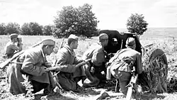 Nearly all artillery, including howitzers, guns, anti-aircraft and rockets, were tasked with anti-tank defence.[160] Dug-in tanks and self-propelled guns further strengthened the anti-tank defences.[151][160] Anti-tank forces were incorporated into every level of command, mostly as anti-tank strong points with the majority concentrated on likely attack routes and the remainder amply spread out elsewhere.[160] Each anti-tank strong-point typically consisted of four to six anti-tank guns, six to nine anti-tank rifles, and five to seven heavy and light machine guns. They were supported by mobile obstacle detachments as well as by infantry with automatic firearms.[98] Independent tank and self-propelled gun brigades and regiments were tasked with cooperating with the infantry during counterattacks.[98]