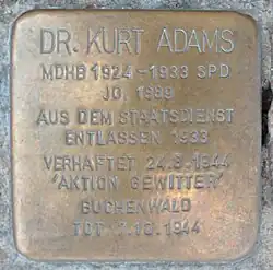 - ^ a b c Dr. Holger Martens. "Adams, Kurt ... Leben und Werk". Arbeitsgemeinschaft ehemals verfolgter Sozialdemokraten (AvS) in der SPD Hamburg. Archived from the original on 17 November 2015. Retrieved 14 November 2015.