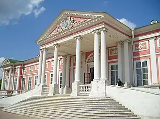 The palace was designed in the new neoclassical style, then becoming popular for state buildings in St. Petersburg and Moscow. The exterior was made of wooden planks, which were plastered and painted in soft pastel colors. The palace looked out onto a court of honor, formed by the palace, the church and the large lake. The six-column portico at the front of the house was designed with a ramp so that carriages with as many as eight horses could come directly to the front door. When the carriage arrived, servants would rush out the front doors and hold the horses while the guests descended.[10]