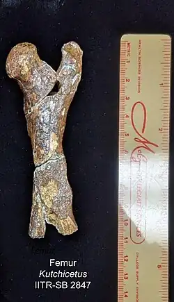 Kutchicetus is an extinct genus of early whale of the family Remingtonocetidae that lived during Early-Middle Eocene (Lutetian and Ypresian) in what is now the coastal border of Pakistan and India (23°42′N 68°42′E / 23.7°N 68.7°E, paleocoordinates 6°00′N 61°48′E / 6.0°N 61.8°E).[1][2] It is closely related to Andrewsiphius with which it was synonymized by Gingerich et al. 2001.[3] Thewissen & Bajpai 2009 proposed a new clade, Andrewsiphiinae, for the two species. Later authors,[4] however, still accept both as separate genera.