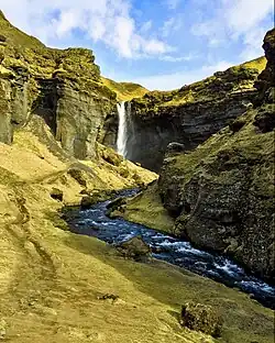 The Kvernufoss waterfall is located near the village of Skógar and the gorge of the waterfall can be seen from the Hringvegur, the loop road that circles the whole of Iceland. It can be reached by walking less than a kilometre from the car park of the Skógar Museum along a path up the canyon.[2]